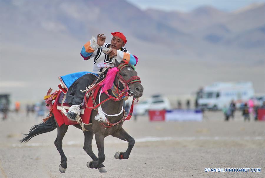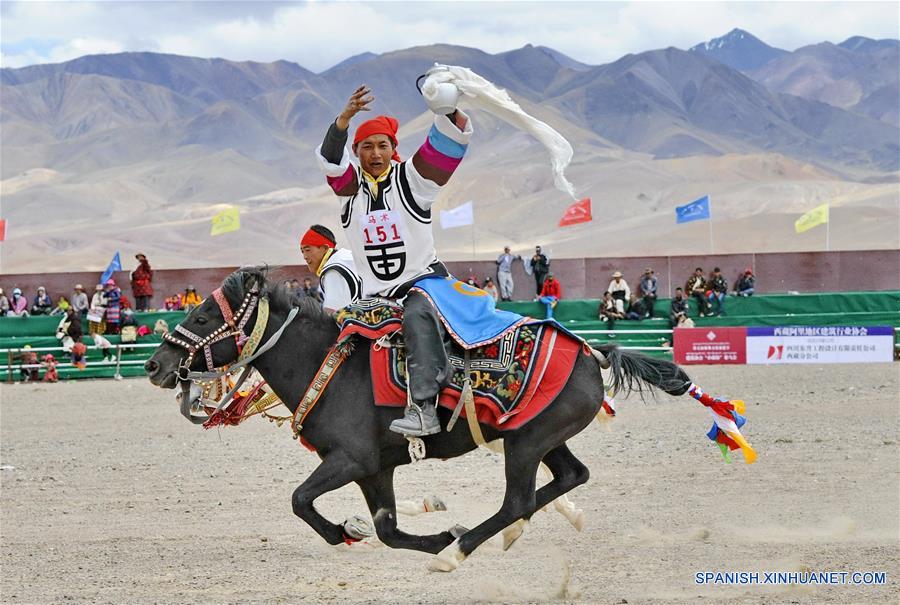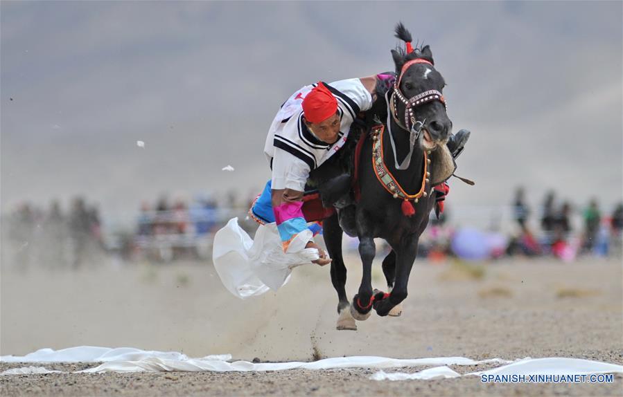 ALI, diciembre 7, 2018 (Xinhua) -- Imagen del 29 de julio de 2018 de un jinete participando en la competencia de recolección de Hada a caballo, en Ali, en la Región Autónoma del Tíbet, en el suroeste de China. Con la mejora de la infraestructura del transporte, los caballos, que una vez desempe?aron un papel importante en la vida cotidiana de los tibetanos, se convirtieron gradualmente en una forma de comunicación que rara vez se utilizaba. Hoy en día, los caballos han regresado a la vida de los tibetanos a medida que la cultura festiva y el turismo experimentan un desarrollo floreciente. (Xinhua/Zhang Rufeng)