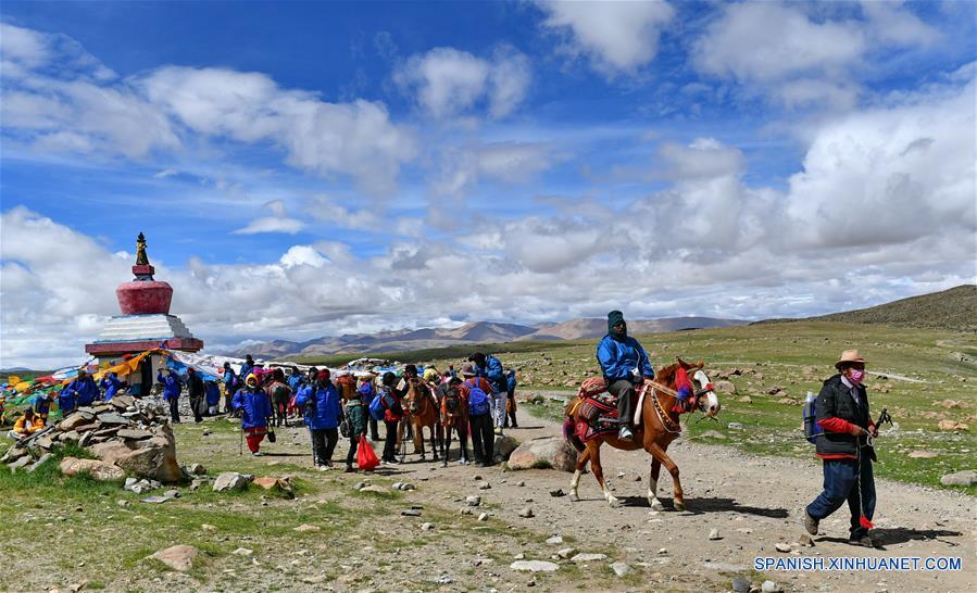 ALI, diciembre 7, 2018 (Xinhua) -- Imagen del 28 de julio de 2018 de un grupo de pastores ofreciendo servicio a los peregrinos indios, en Ali, en la Región Autónoma del Tíbet, en el suroeste de China. Con la mejora de la infraestructura del transporte, los caballos, que una vez desempe?aron un papel importante en la vida cotidiana de los tibetanos, se convirtieron gradualmente en una forma de comunicación que rara vez se utilizaba. Hoy en día, los caballos han regresado a la vida de los tibetanos a medida que la cultura festiva y el turismo experimentan un desarrollo floreciente. (Xinhua/Zhang Rufeng)