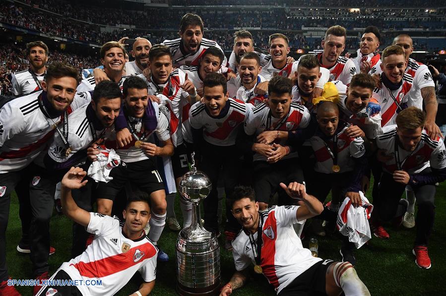 MADRID, diciembre 9, 2018 (Xinhua) -- Imagen proveída por la agencia de noticias Télam de jugadores de River Plate celebrando al término del partido de la final de la Copa Libertadores 2018, ante Boca Juniors, celebrado en el Estadio Santiago Bernabéu, en Madrid, Espa?a, el 9 de diciembre de 2018. (Xinhua/José Romero/TELAM)