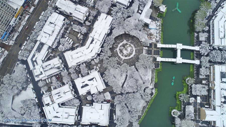 ZHEJIANG, diciembre 10, 2018 (Xinhua) -- Vista aérea del 9 de diciembre de 2018 del paisaje nevado del condado Deqing, en la ciudad Huzhou, en la provincia de Zhejiang, en el este de China. (Xinhua/Xie Shangguo)