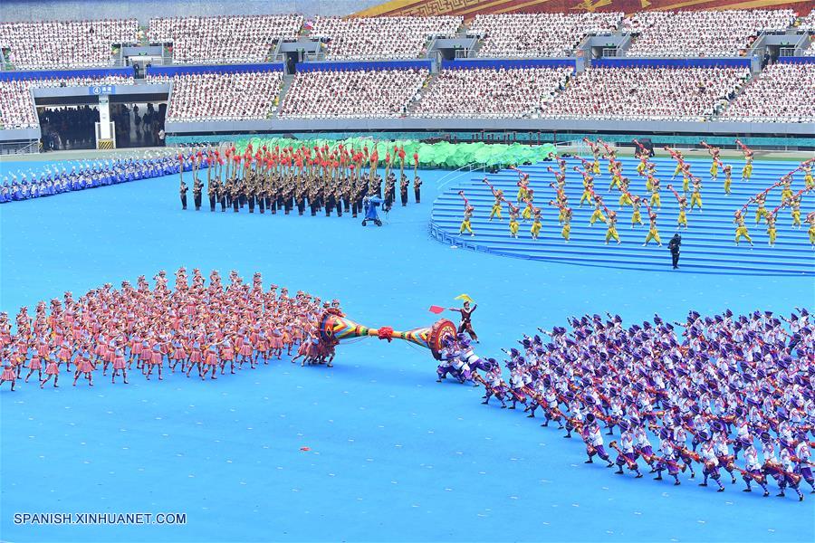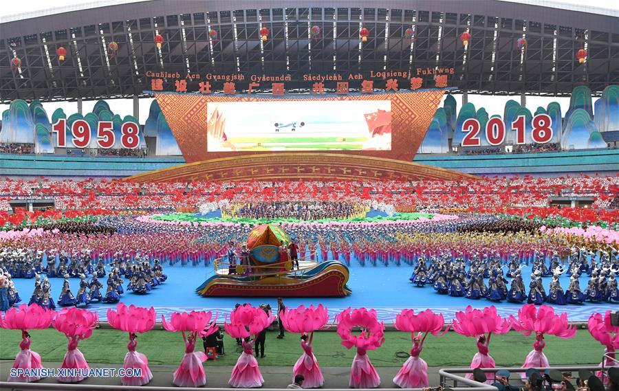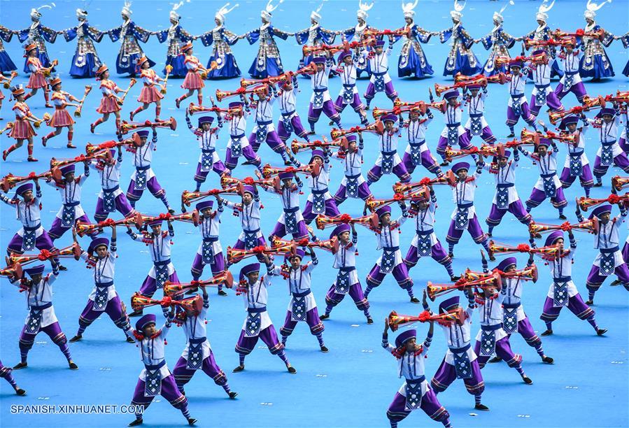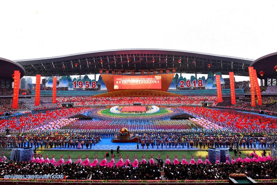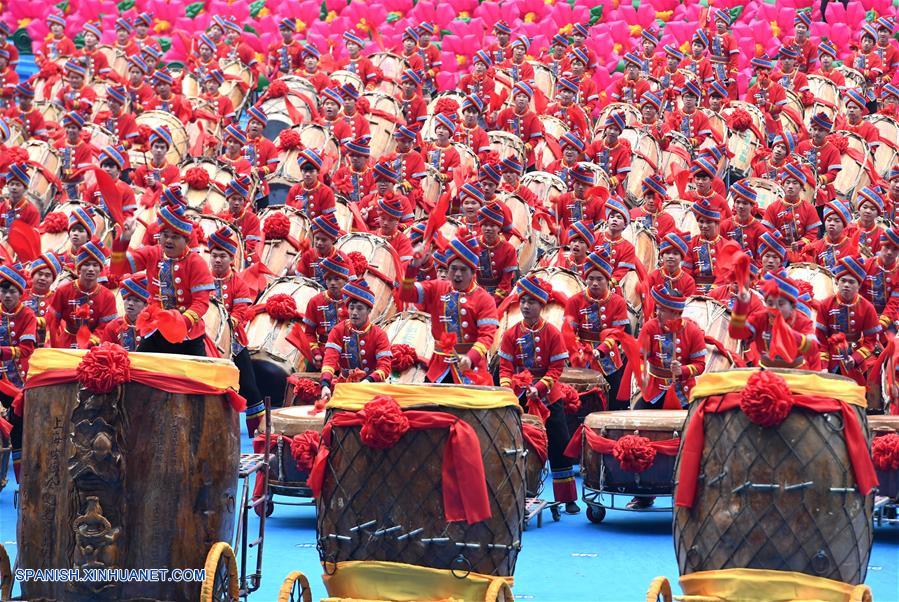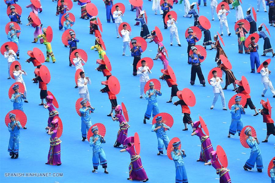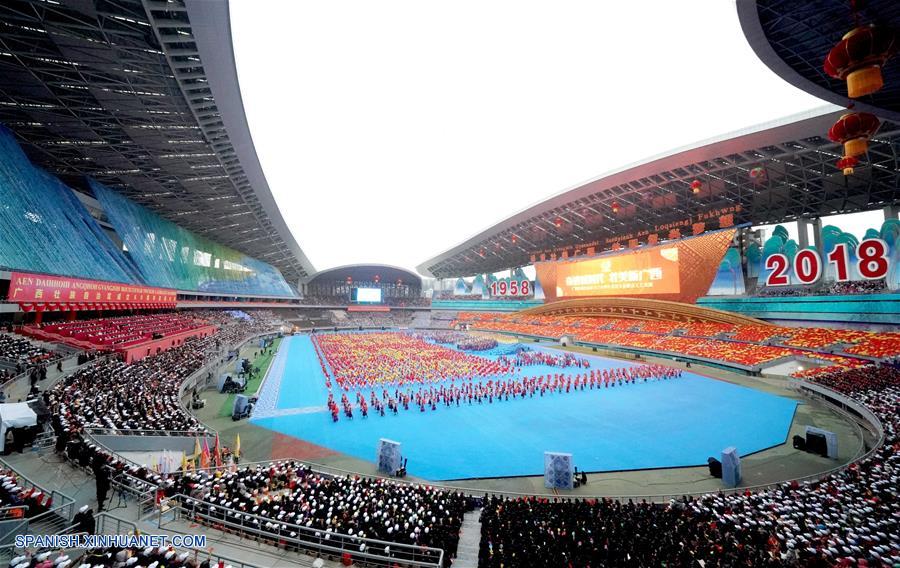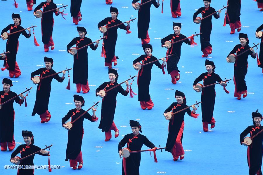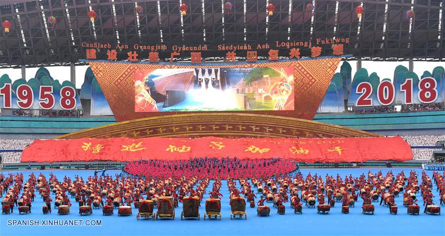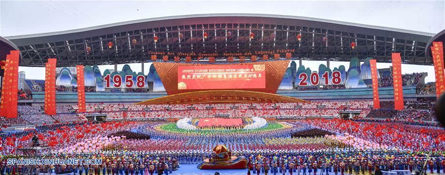 GUANGXI, diciembre 10, 2018 (Xinhua) -- Bailarines realizan una gran reunión para conmemorar el 60 aniversario de la fundación de la Región Autónoma Zhuang de Guangxi, en Nanning, capital de Guangxi, en el sur de China, el 10 de diciembre de 2018. (Xinhua/Chen Jianli)