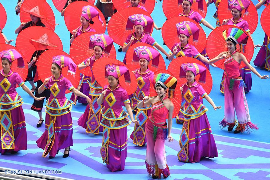 GUANGXI, diciembre 10, 2018 (Xinhua) -- Bailarines participan en una gran reunión para conmemorar el 60 aniversario de la fundación de la Región Autónoma Zhuang de Guangxi, en Nanning, capital de Guangxi, en el sur de China, el 10 de diciembre de 2018. (Xinhua/Shen Hong)