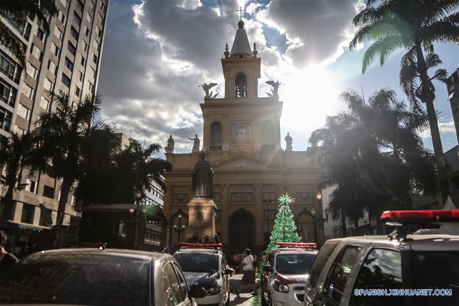 Oficiales de policía permanecen frente a la Catedral de Campinas, lugar donde se registró un tiroteo, en la ciudad de Campinas, en el estado de Sao Paulo, Brasil, el 11 de diciembre de 2018. (Xinhua/Rahel Patrasso)