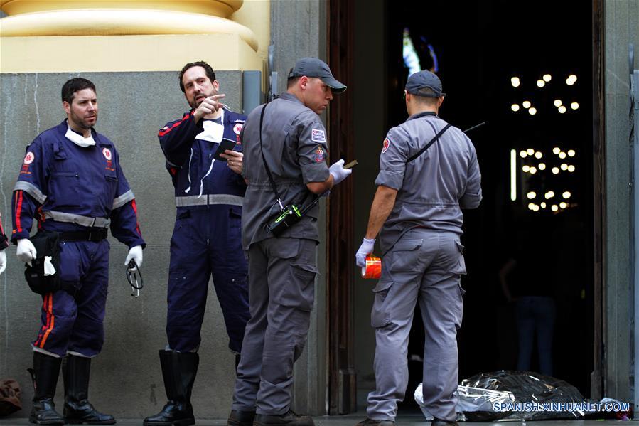 SAO PAULO, diciembre 11, 2018 (Xinhua) -- Imagen proveída por AGENCIA ESTADO de miembros de los cuerpos de rescate trabajando en el interior de la Catedral de Campinas, lugar donde se registró un tiroteo, en la ciudad de Campinas, en el estado de Sao Paulo, Brasil, el 11 de diciembre de 2018. Al menos cuatro personas fueron asesinadas el martes a balazos por un desconocido que ingresó disparando con dos armas de fuego a la Catedral de Campinas, durante una misa, y luego se suicidó. La tragedia fue perpetrada durante la misa del mediodía y el asesino disparó al menos 20 tiros, para luego suicidarse cerca del altar, tras enfrentar a los policías, informó un portavoz del departamento de bomberos citado por la "TV Globo". El vocero agregó que por el momento se desconoce el motivo del agresor. (Xinhua/Maycon Soldan/FOTOARENA/AGENCIA ESTADO)