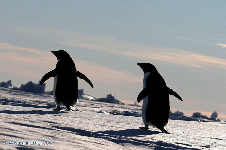 A BORDO DEL XUELONG, diciembre 10, 2018 (Xinhua) -- Imagen del 2 de diciembre de 2018 de pingüinos adelaida caminando cerca del rompehielos de investigación Xuelong de China, en la Antártida. El rompehielos de investigación Xuelong de China, también conocido como Dragón de Nieve, está ahora a 44 kilómetros de la estación Zhongshan. Las operaciones de descarga se llevaron a cabo una vez determinadas las rutas de transporte. (Xinhua/Liu Shiping)