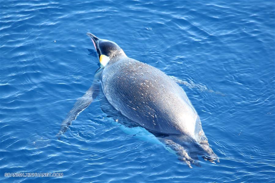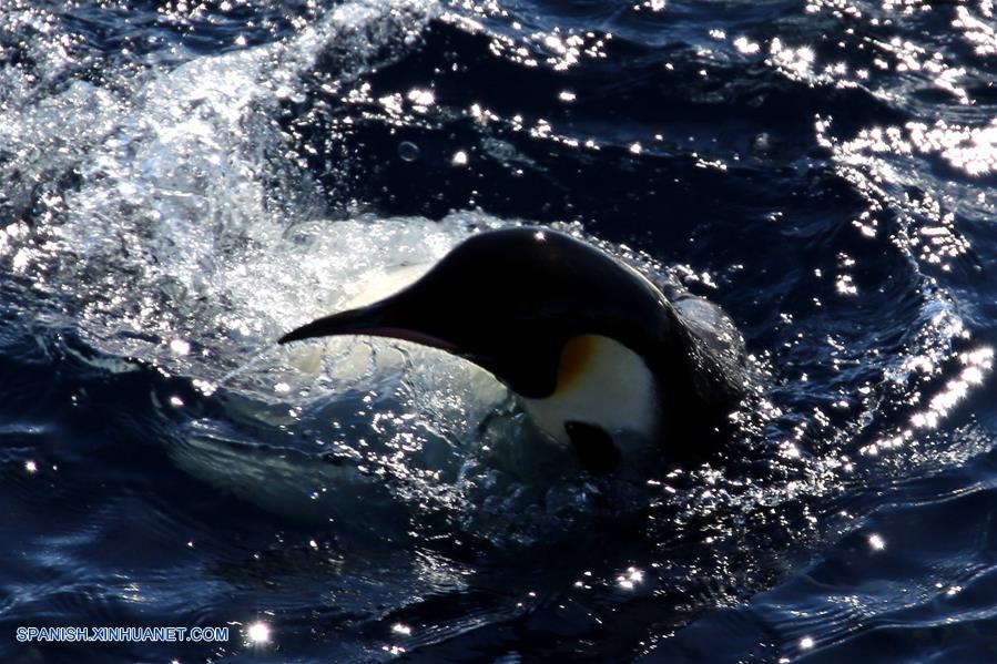 A BORDO DEL XUELONG, diciembre 10, 2018 (Xinhua) -- Imagen del 5 de diciembre de 2018 de un pingüino emperador nadando cerca del rompehielos de investigación Xuelong de China, en la Antártida. El rompehielos de investigación Xuelong de China, también conocido como Dragón de Nieve, está ahora a 44 kilómetros de la estación Zhongshan. Las operaciones de descarga se llevaron a cabo una vez determinadas las rutas de transporte. (Xinhua/Liu Shiping)