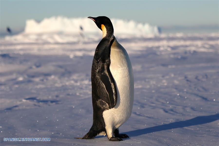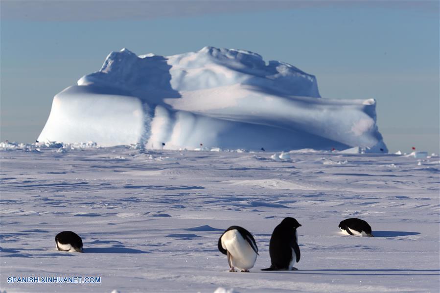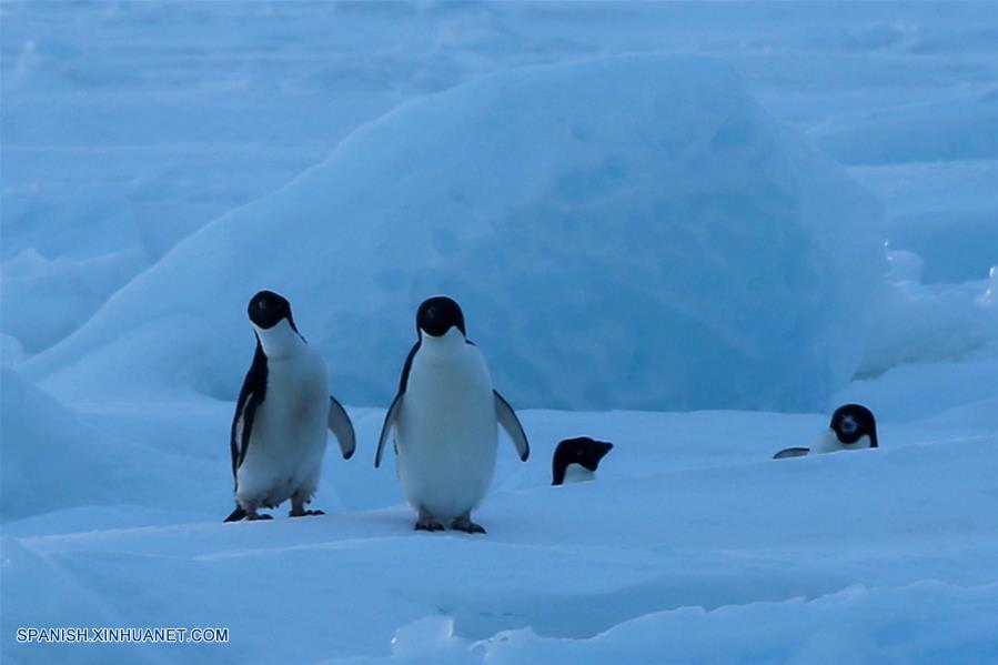 A BORDO DEL XUELONG, diciembre 10, 2018 (Xinhua) -- Imagen del 5 de diciembre de 2018 de pingüinos emperador cerca del rompehielos de investigación Xuelong de China, en la Antártida. El rompehielos de investigación Xuelong de China, también conocido como Dragón de Nieve, está ahora a 44 kilómetros de la estación Zhongshan. Las operaciones de descarga se llevaron a cabo una vez determinadas las rutas de transporte. (Xinhua/Liu Shiping)