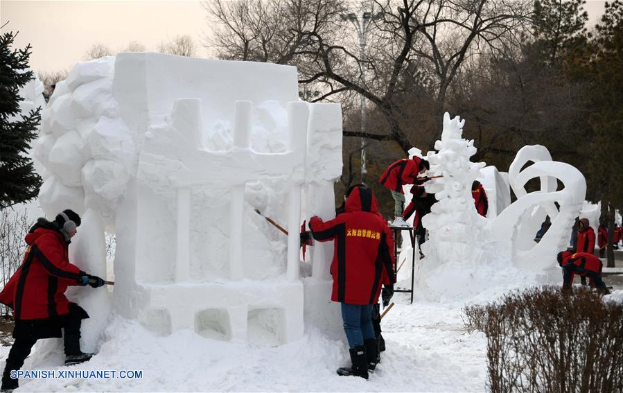 HEILONGJIANG, diciembre 12, 2018 (Xinhua) -- Concursantes tallan una escultura de nieve durante el 6 Concurso de Escultura de Nieve de Estudiantes Universitarios de la provincia de Heilongjiang, en el Parque Internacional de Exposiciones de Arte de Escultura de Nieve Isla del Sol, en Harbin, capital de la provincia de Heilongjiang, en el noreste de China, el 12 de diciembre de 2018. El 6 Concurso de Escultura de Nieve de Estudiantes Universitarios de la provincia de Heilongjiang comenzó el lunes con la participación de 35 equipos. (Xinhua/Wang Jianwei)