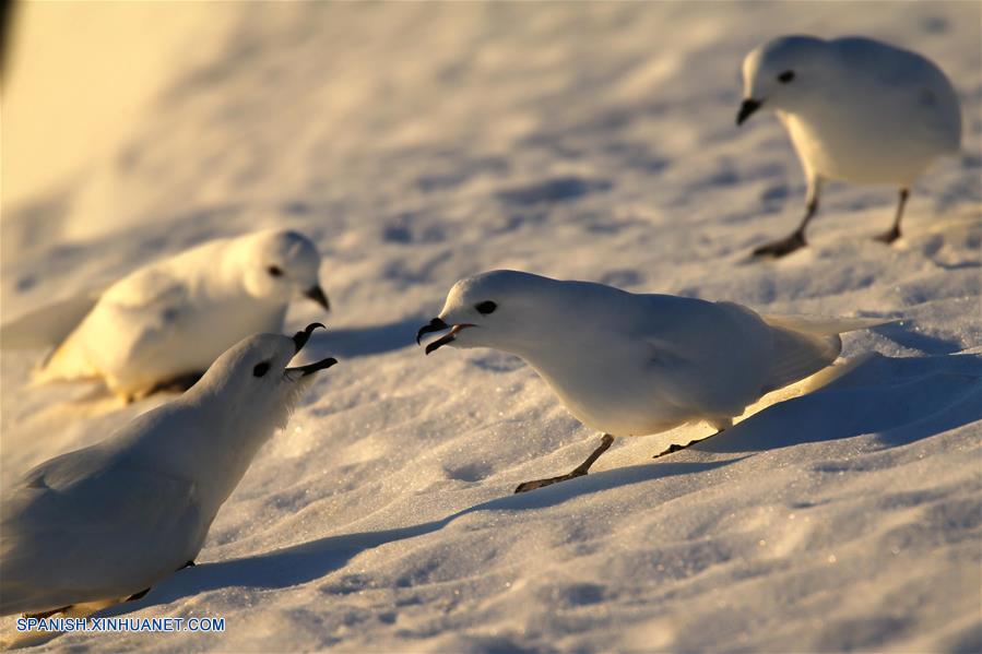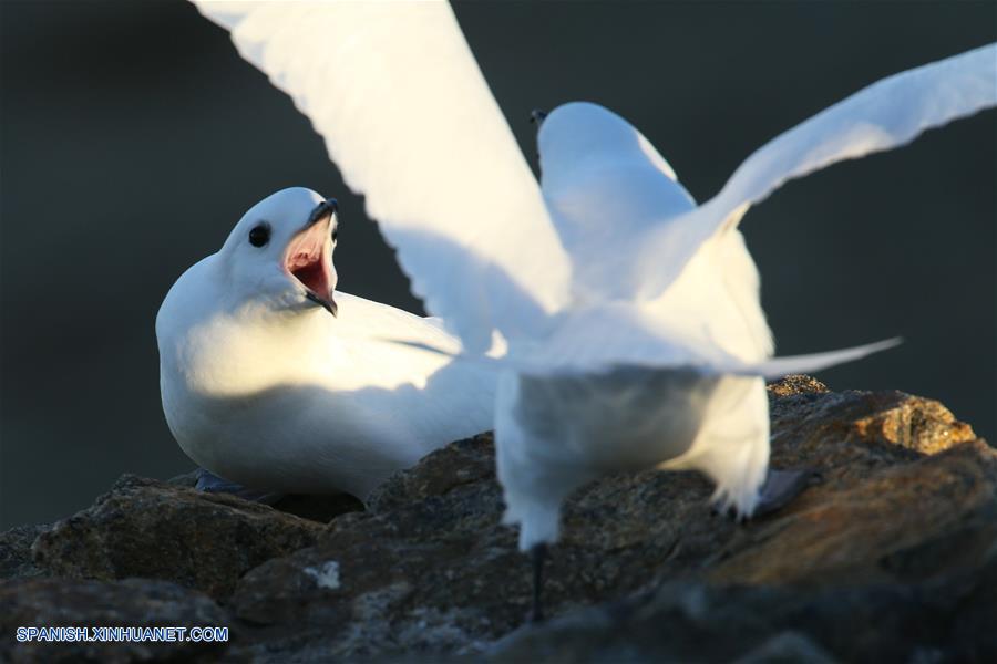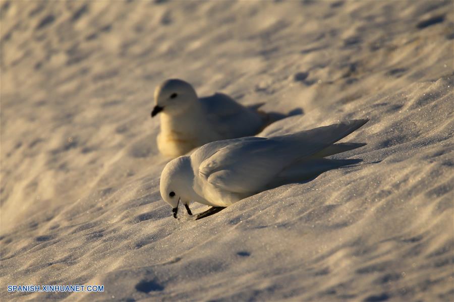 A BORDO DEL XUELONG, diciembre 12, 2018 (Xinhua) -- Imagen del 10 de diciembre de 2018 de una vista de petreles níveos captados cerca de la estación Zhongshan en la Antártida. El rompehielos de investigación Xuelong de China, también conocido como Dragón de Nieve, está ahora a 44 kilómetros de la estación Zhongshan. Las operaciones de descarga se llevaron a cabo una vez determinadas las rutas de transporte. (Xinhua/Liu Shiping)