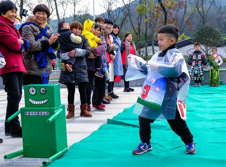 ZHEJIANG, diciembre 12, 2018 (Xinhua) -- Alumnos de un jardín de ni?os local participan en un desfile de moda ecológica durante una actividad de sensibilización ambiental, en la villa de Qingcaowu del municipio de Lijiaxiang en el condado de Changxing, en Huzhou, provincia de Zhejiang, en el este de China, el 12 de diciembre de 2018. (Xinhua/Xu Yu)