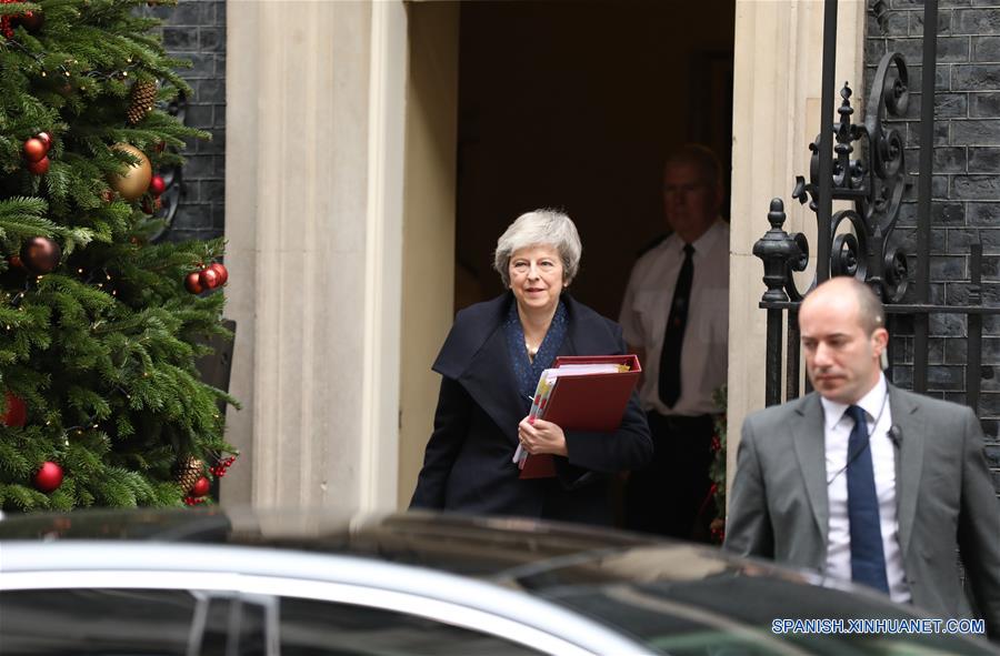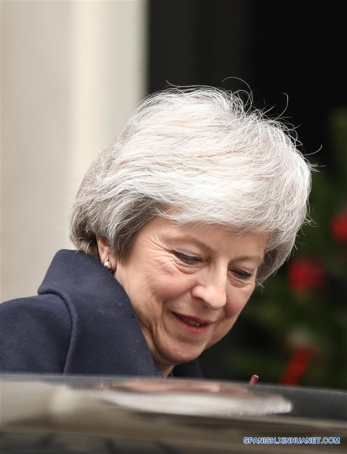 LONDRES, diciembre 12, 2018 (Xinhua) -- La primera ministra de Reino Unido, Theresa May, sale del número 10 de la calle Downing para asistir a la sesión de Preguntas a la Primera Ministra (PPM) en la Cámara de los Comunes, en Londres, Reino Unido, el 12 de diciembre de 2018. La primera ministra británica, Theresa May, se enfrentará el miércoles a una moción de confianza, anunció Grahan Brady, presidente del Comité 1922, que reúne a los diputados del Partido Conservador en la Cámara de los Comunes. (Xinhua/Isabel Infantes)