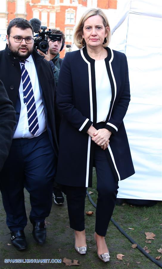 LONDRES, diciembre 12, 2018 (Xinhua) -- La secretaria del Trabajo y Pensiones de Reino Unido, Amber Rudd, conversa con representantes de los medios de comunicación frente a las Cámaras del Parlamento, en Londres, Reino Unido, el 12 de diciembre de 2018. Los parlamentarios del Partido Conservador de Reino Unido iniciaron la noche del miércoles el proceso para un voto de confianza contra la primera ministra Theresa May, el primero de su tipo en cerca de 40 a?os. La votación decidirá el destino político de la primera ministra, si conservará el puesto o tendrá que dejarlo. (Xinhua/Isabel Infantes)