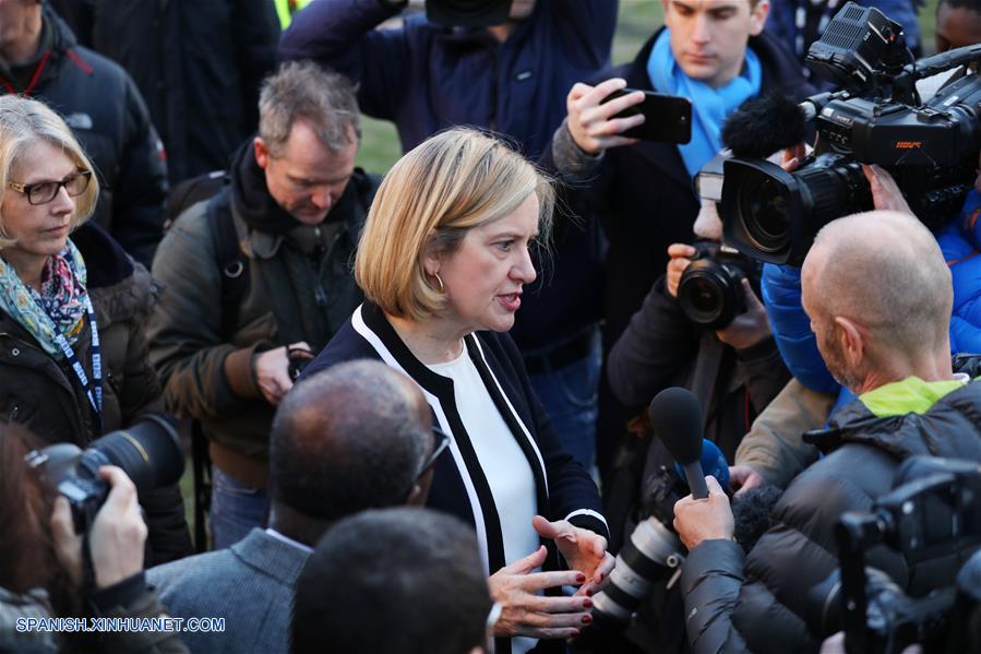 LONDRES, diciembre 12, 2018 (Xinhua) -- La secretaria del Trabajo y Pensiones de Reino Unido, Amber Rudd (c), conversa con representantes de los medios de comunicación frente a las Cámaras del Parlamento, en Londres, Reino Unido, el 12 de diciembre de 2018. Los parlamentarios del Partido Conservador de Reino Unido iniciaron la noche del miércoles el proceso para un voto de confianza contra la primera ministra Theresa May, el primero de su tipo en cerca de 40 a?os. La votación decidirá el destino político de la primera ministra, si conservará el puesto o tendrá que dejarlo. (Xinhua/Isabel Infantes)