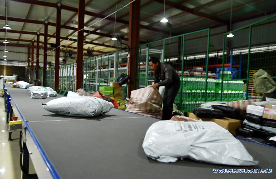HUNAN, diciembre 12, 2018 (Xinhua) -- Un trabajador clasifica paquetes en una compa?ía de logística, en el Condado Autónomo Chengbu Miao de Shaoyang, provincia de Hunan, en el centro de China, el 12 de diciembre de 2018. Al caer el 12 de diciembre, el festival de compras en línea "Doble 12" ha brindado mayores oportunidades de negocios al comercio electrónico y las empresas de logística de China. (Xinhua/Yan Qinlong)