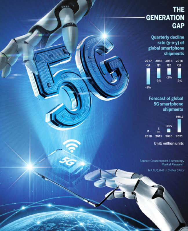 El advenimiento del 5G entusiasma a la cadena de ensamblado de teléfonos inteligentes, pues debido a la saturación del mercado las ventas han ido en declive durante seis trimestres consecutivos.