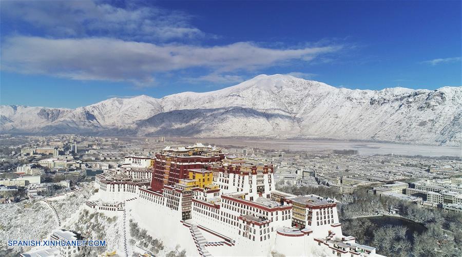 LHASA, diciembre 19, 2018 (Xinhua) -- Vista aérea del Palacio de Potala cubierto de nieve, en Lhasa, capital de la Región Autónoma del Tíbet, en el suroeste de China, el 19 de diciembre de 2018. Lhasa fue testigo el martes de la primera nevada de este invierno. (Xinhua/Purbu Zhaxi)