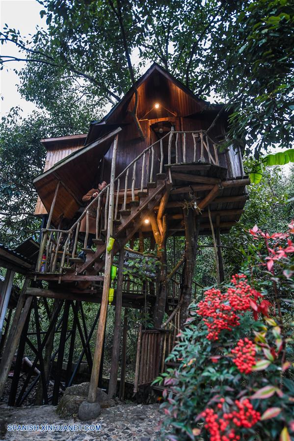ZHEJIANG, diciembre 19, 2018 (Xinhua) -- Vista de la casa de árbol en un hostal en la antigua localidad de Heqiao en Hangzhou, capital de la provincia de Zhejiang, en el este de China, el 19 de diciembre de 2018. El turismo familiar está en auge cuando el gobierno local ha hecho constantes esfuerzos en la reinvención las zonas rurales. (Xinhua/Xu Yu)