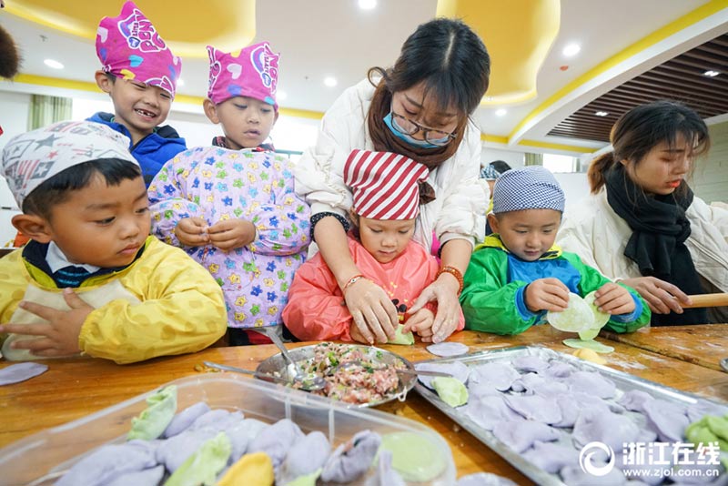 Changxing, Zhejiang, 21/12/2018(El Pueblo en Línea) - El 20 de diciembre, más de 20 ni?os de la guardería del Centro Taihu Tuying del condado de Changxing aprendieron juntos dumplings. El mismo día, la escuela llevó a cabo una actividad para dar la bienvenida al solsticio de invierno, permitiendo a los ni?os experimentar el ambiente tradicional de la cultura del festival a través de actividades como amasar la harina y hacer dumplings para dar la bienvenida al solsticio de invierno. (Foto por Wu Zheng y Zhang Zemin)