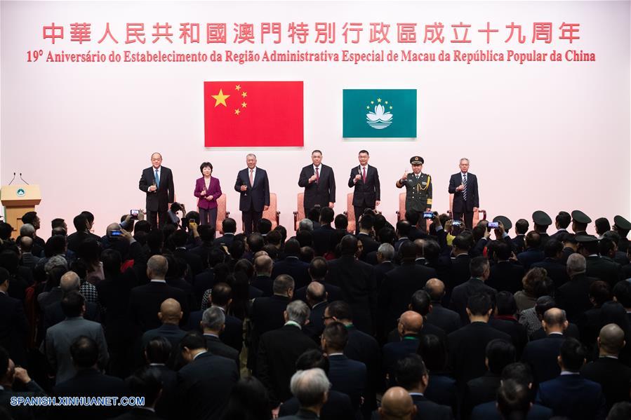 MACAO, diciembre 20, 2018 (Xinhua) -- Invitados de honor proponen un brindis durante una recepción para celebrar el XIX aniversario del regreso de Macao a la patria, en Macao, en el sur de China, el 20 de diciembre de 2018. (Xinhua/Cheong Kam Ka)