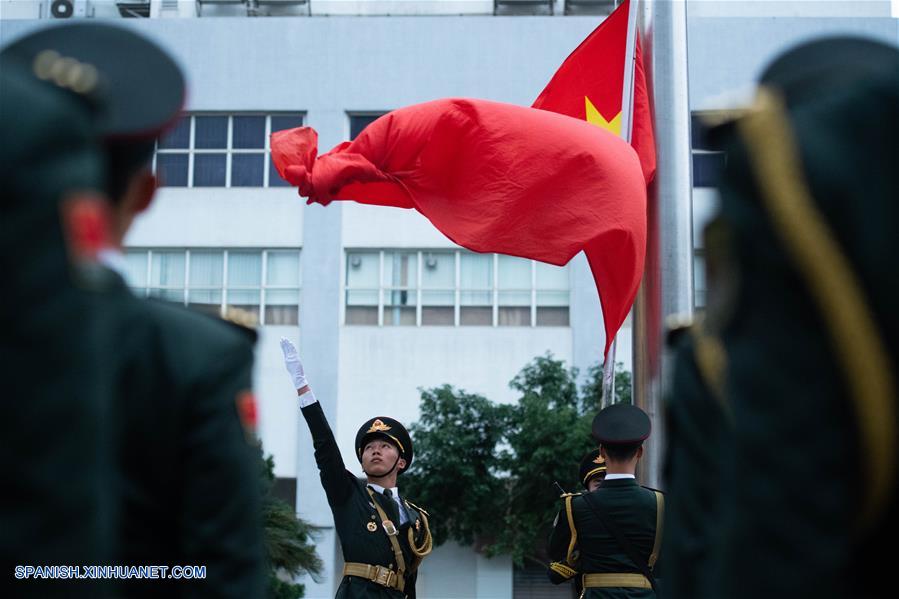 MACAO, diciembre 20, 2018 (Xinhua) -- La guarnición de Macao del Ejército Popular de Liberación (EPL) sostiene una ceremonia de izamiento de bandera para celebrar el XIX aniversario del regreso de Macao a la patria, en Macao, en el sur de China, el 20 de diciembre de 2018. (Xinhua/Cheong Kam Ka)