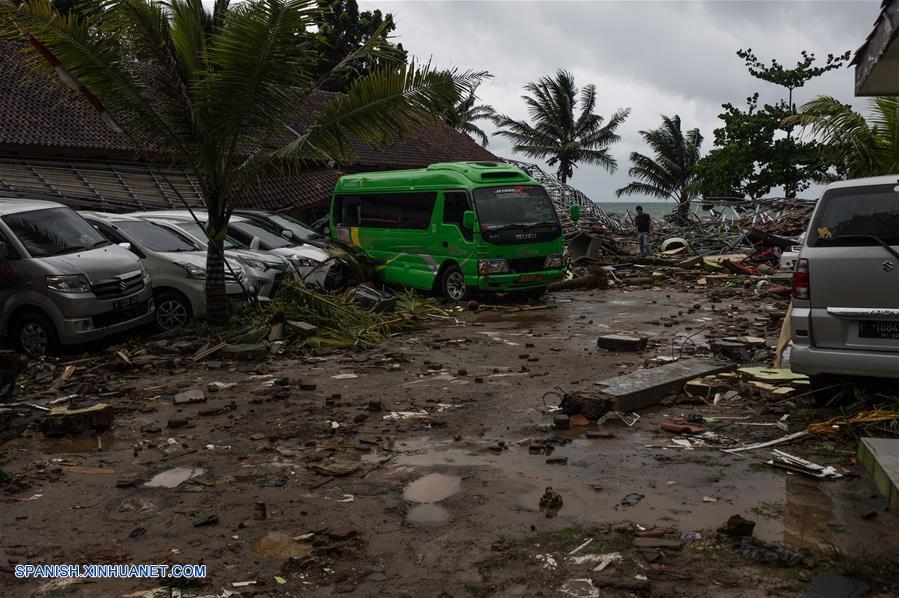 BANTEN, diciembre 23, 2018 (Xinhua) -- Vehículos permanecen en medio de los escombros luego de que un tsunami alcanzara el Estrecho de la Sonda, en Pandeglang, provincia de Bantén, Indonesia, el 23 de diciembre de 2018. Las muertes por un tsunami ocasionado por una erupción volcánica en Indonesia llegaron a 222 con al menos 843 heridos, informó el domingo la agencia para el manejo de desastres. La erupción del volcán Anak Krakatau, o Child of Krakatoa en inglés, provocó el sábado deslizamientos submarinos de tierra ocasionando el aumento del nivel del mar el sábado en la noche, de acuerdo con la agencia de meteorología y geofísica. El tsunami destruyó 556 casas, nueve hoteles y 360 barcos en el distrito de Pandeglang, el área más afectada, así como la provincia de Serang of Bantén y el distrito de Lampung Selatan en la provincia de Lampung, dijo el vocero de la agencia nacional para el manejo de desastres, Sutopo Purwo Nugroho. (Xinhua/Veri Sanovri)