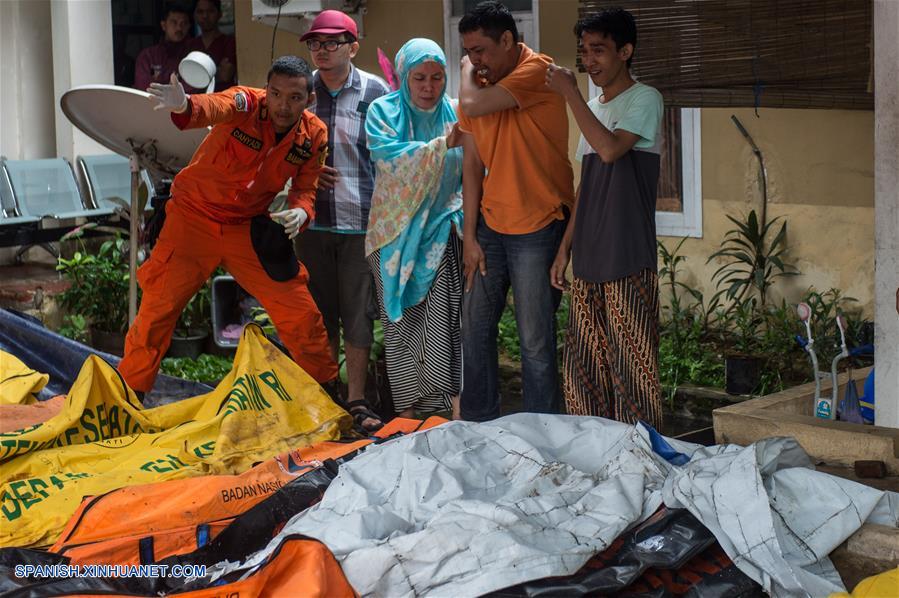 BANTEN, diciembre 23, 2018 (Xinhua) -- Personas reaccionan tras encontrar a familiares en bolsas para cadáveres de víctimas del tsunami que alcanzó el Estrecho de la Sonda, en Pandeglang, provincia de Bantén, Indonesia, el 23 de diciembre de 2018. Las muertes por un tsunami ocasionado por una erupción volcánica en Indonesia llegaron a 222 con al menos 843 heridos, informó el domingo la agencia para el manejo de desastres. La erupción del volcán Anak Krakatau, o Child of Krakatoa en inglés, provocó el sábado deslizamientos submarinos de tierra ocasionando el aumento del nivel del mar el sábado en la noche, de acuerdo con la agencia de meteorología y geofísica. El tsunami destruyó 556 casas, nueve hoteles y 360 barcos en el distrito de Pandeglang, el área más afectada, así como la provincia de Serang of Bantén y el distrito de Lampung Selatan en la provincia de Lampung, dijo el vocero de la agencia nacional para el manejo de desastres, Sutopo Purwo Nugroho. (Xinhua/Veri Sanovri)