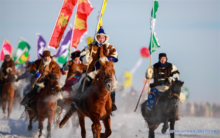 HULUN BUIR, diciembre 23, 2018 (Xinhua) -- Pastores participan en una carrera de caballos durante una feria de hielo y nieve de Nadam en Hulun Buir, en la Región Autónoma de Mongolia Interior, en el norte de China, el 23 de diciembre de 2018. (Xinhua/Ding Genhou)