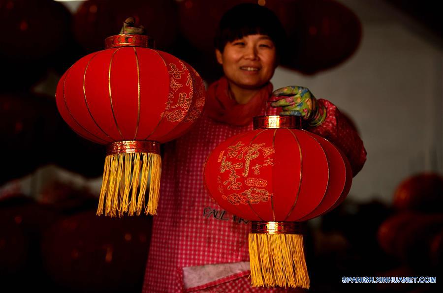 HEBEI, diciembre 23, 2018 (Xinhua) -- Una trabajadora muestra linternas rojas en la aldea de Tuntou, distrito de Gaocheng, en la ciudad de Shijiazhuang, en la provincia de Hebei, en el norte de China, el 23 de diciembre de 2018. Conforme el A?o Nuevo se acerca, los artesanos de linternas en Gaocheng, que es conocido por su manufactura de linternas, se encuentran ocupados con la creación de linternas rojas. (Xinhua/Chen Qibao)