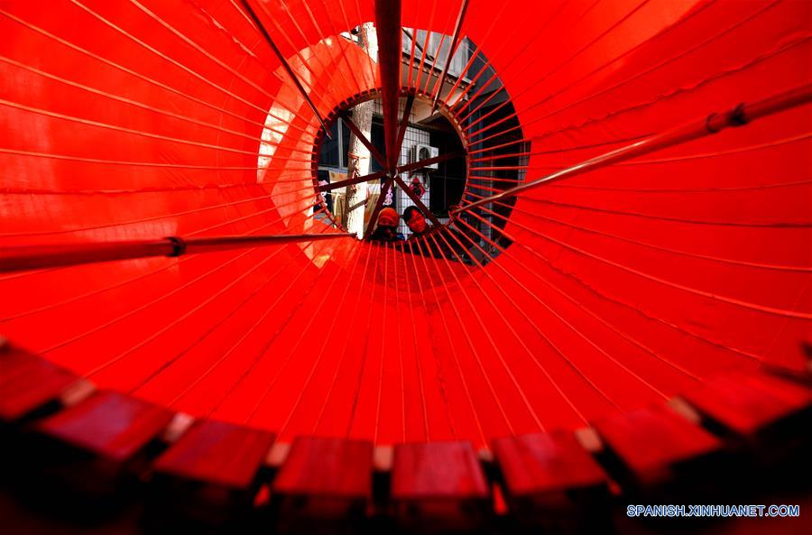 HEBEI, diciembre 23, 2018 (Xinhua) -- Trabajadores crean una linterna roja grande en la aldea de Tuntou, distrito de Gaocheng, en la ciudad de Shijiazhuang, en la provincia de Hebei, en el norte de China, el 23 de diciembre de 2018. Conforme el A?o Nuevo se acerca, los artesanos de linternas en Gaocheng, que es conocido por su manufactura de linternas, se encuentran ocupados con la creación de linternas rojas. (Xinhua/Chen Qibao)