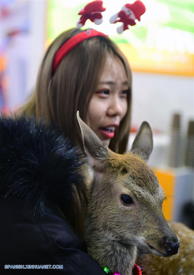 JILIN, diciembre 23, 2018 (Xinhua) -- Una mujer interactúa con un venado sika, durante la tercera Exposición de la Industria de Hielo y Nieve de Jilin de China, en Changchun, capital de la provincia de Jilin, en el noreste de China, el 23 de diciembre de 2018. La Exposición de la Industria de Hielo y Nieve de Jilin de China comenzó en el Centro Internacional de Convenciones y Exposiciones de Changchun el domingo. (Xinhua/Lin Hong)