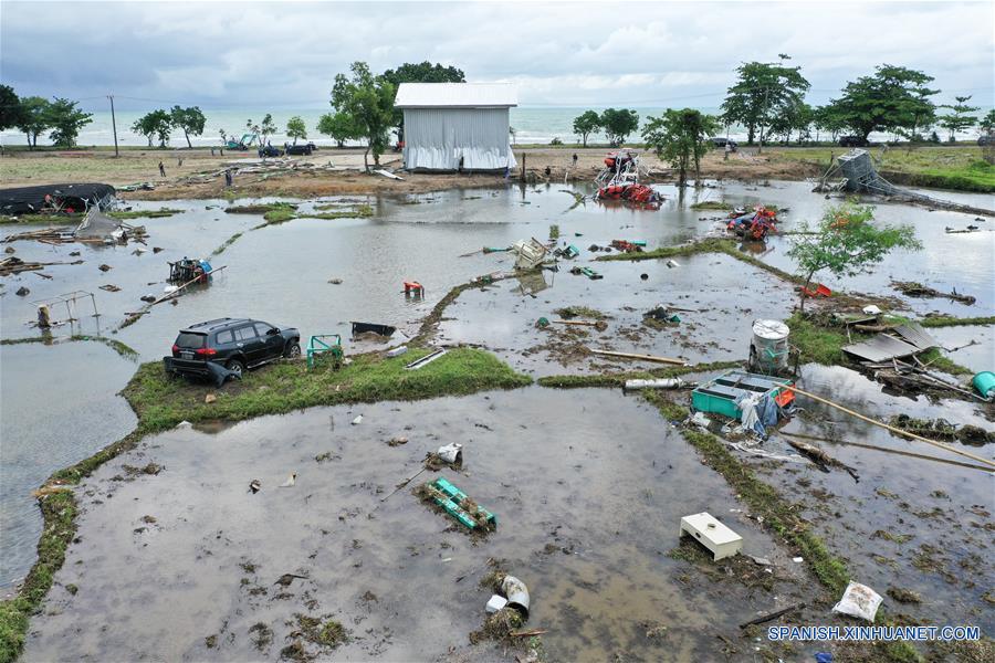 Vista de escombros causados por el tsunami, en la provincia Bantén, Indonesia, el 24 de diciembre de 2018. La agencia de manejo de desastres de Indonesia dijo el lunes que la cifra de muertes a causa del tsunami provocado por una erupción volcánica ascendió a 373, en tanto que la de heridos ha llegado a 1,459. (Xinhua/Du Yu)