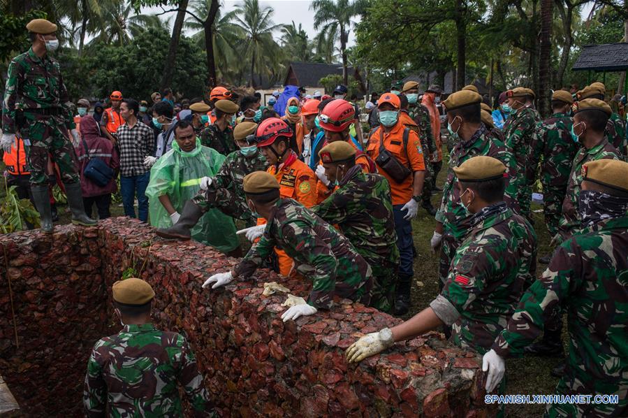 Rescatistas buscan víctimas del tsunami, en el Resort de Tanjung Lesung, en Pandeglang, en la provincia Bantén, Indonesia, el 24 de diciembre de 2018. La agencia de manejo de desastres de Indonesia dijo el lunes que la cifra de muertes a causa del tsunami provocado por una erupción volcánica ascendió a 373, en tanto que la de heridos ha llegado a 1,459. (Xinhua/Veri Sanovri)