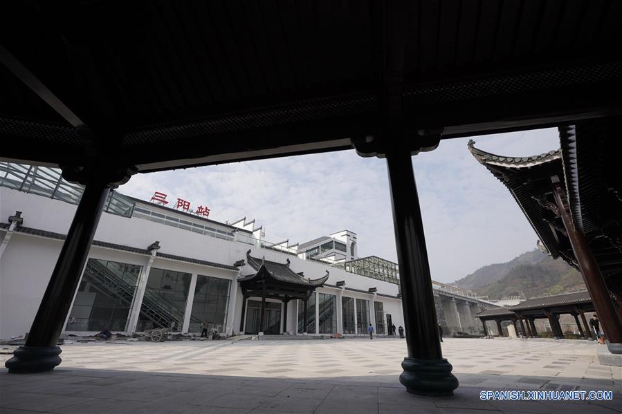 Trabajadores laboran en la estación de trenes Sanyang de la línea de ferrocarril de alta velocidad de Hangzhou-Huangshan en la aldea Sanyang del condado Shexiang, debajo de la ciudad Huangshan, en la provincia de Anhui, en el este de China, el 24 de diciembre de 2018. Se espera que la línea de ferrocarril de Hangzhou-Huangshan, capital de la provincia Zhejiang, en el este de China, la cual es famosa por el el Lago Oeste y Huangshan, y también un famoso hotel en la Monta?a Huangshan entre en funciones el martes, con una velocidad de 250 kilómetros por hora. (Xinhua/Xing Guangli)