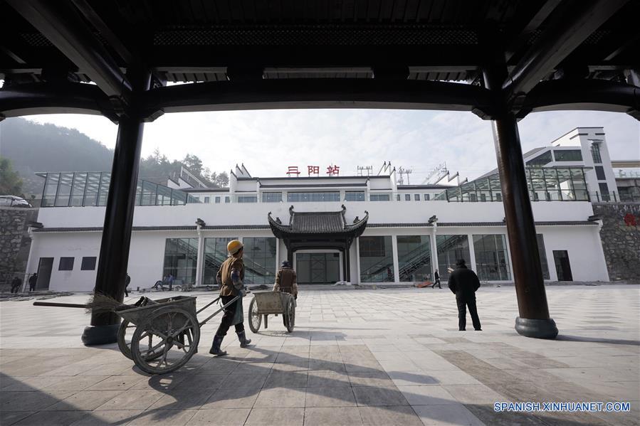 Trabajadores laboran en la estación de trenes Sanyang de la línea de ferrocarril de alta velocidad de Hangzhou-Huangshan en la aldea Sanyang del condado Shexiang, debajo de la ciudad Huangshan, en la provincia de Anhui, en el este de China, el 24 de diciembre de 2018. Se espera que la línea de ferrocarril de Hangzhou-Huangshan, capital de la provincia Zhejiang, en el este de China, la cual es famosa por el el Lago Oeste y Huangshan, y también un famoso hotel en la Monta?a Huangshan entre en funciones el martes, con una velocidad de 250 kilómetros por hora. (Xinhua/Xing Guangli)
