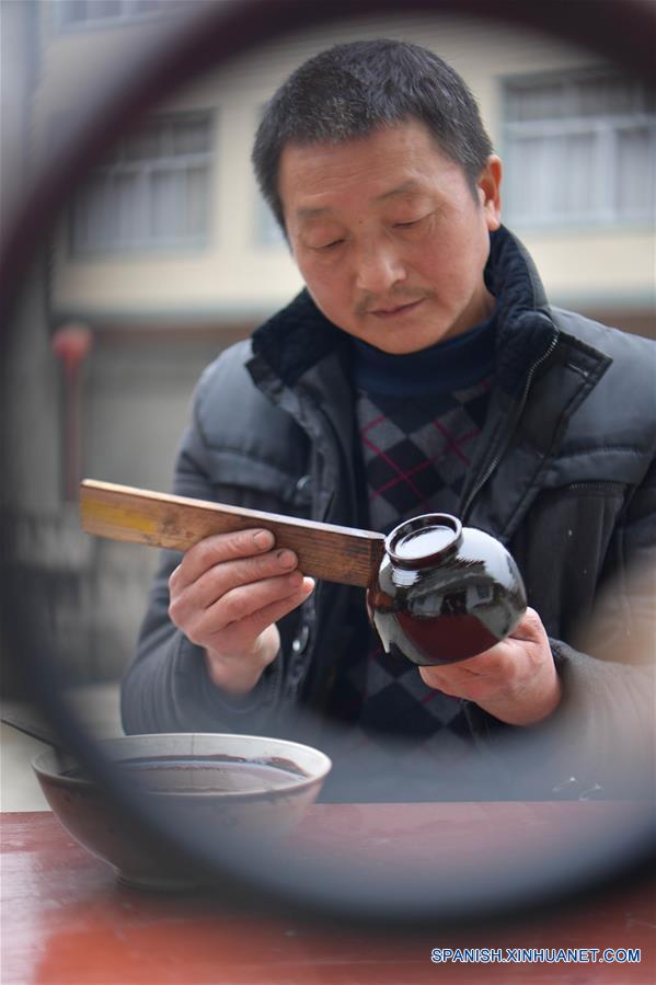 Un artesano de laca pinta un tazón en la aldea de Maoba, en la ciudad de Lichuan, en la provincia de Hubei, en el centro China, el 24 de diciembre de 2018. Las artesanías de madera hechas de una laca producida localmente llamada "Ba" son populares en el mercado. (Xinhua/Yang Shunpi)