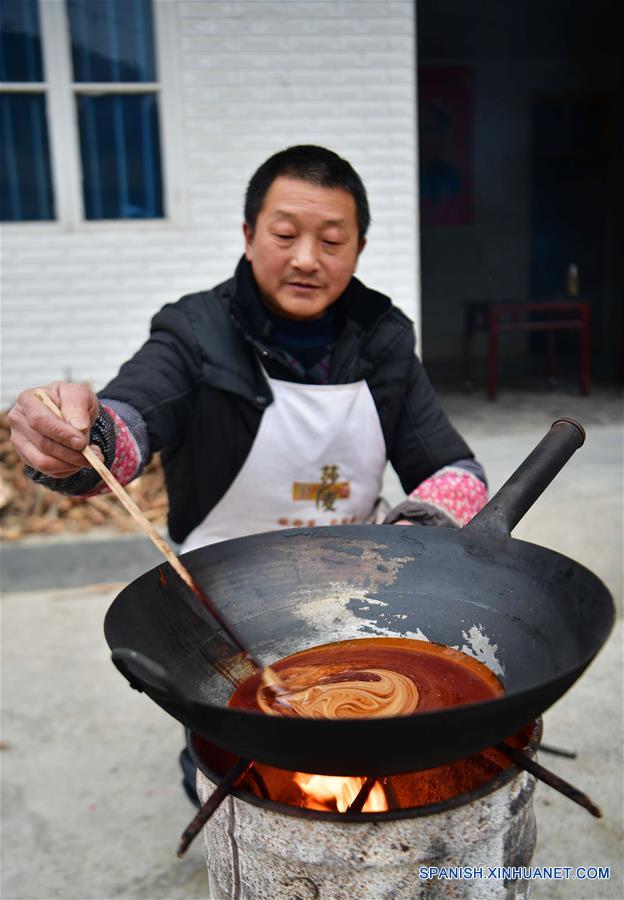 Un artesano hierve laca en la aldea de Maoba, en la ciudad de Lichuan, en la provincia de Hubei, en el centro China, el 24 de diciembre de 2018. Las artesanías de madera hechas de una laca producida localmente llamada "Ba" son populares en el mercado. (Xinhua/Yang Shunpi)