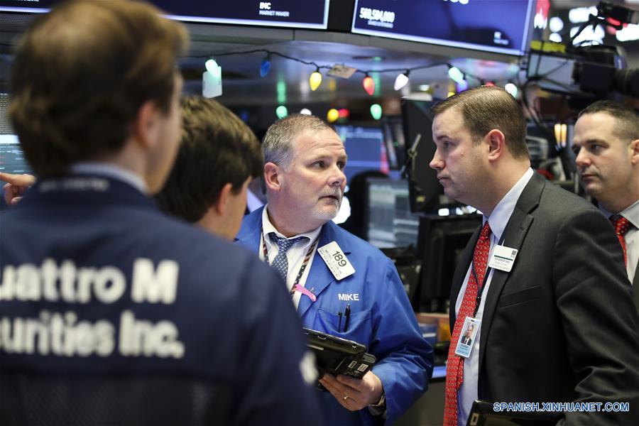 Comerciantes trabajan en la Bolsa de Valores de Nueva York, en Nueva York, Estados Unidos, el 24 de diciembre de 2018. Wall Street cerró el lunes con enormes pérdidas y la mayoría de los principales índices registraron su peor víspera de Navidad, con lo que extendieron las pérdidas de la semana anterior. El Promedio Industrial Dow Jones perdió 653.17 puntos, o 2.91 por ciento, para terminar en 21,792.20 unidades. El índice Standard & Poor's 500 cayó 65.52 puntos, o 2.71 por ciento, para ubicarse en 2,351.10 unidades. El índice compuesto Nasdaq disminuyó 140.08 puntos, o 2.21 por ciento, para cerrar en 6,192.92 unidades. (Xinhua/Wang Ying)