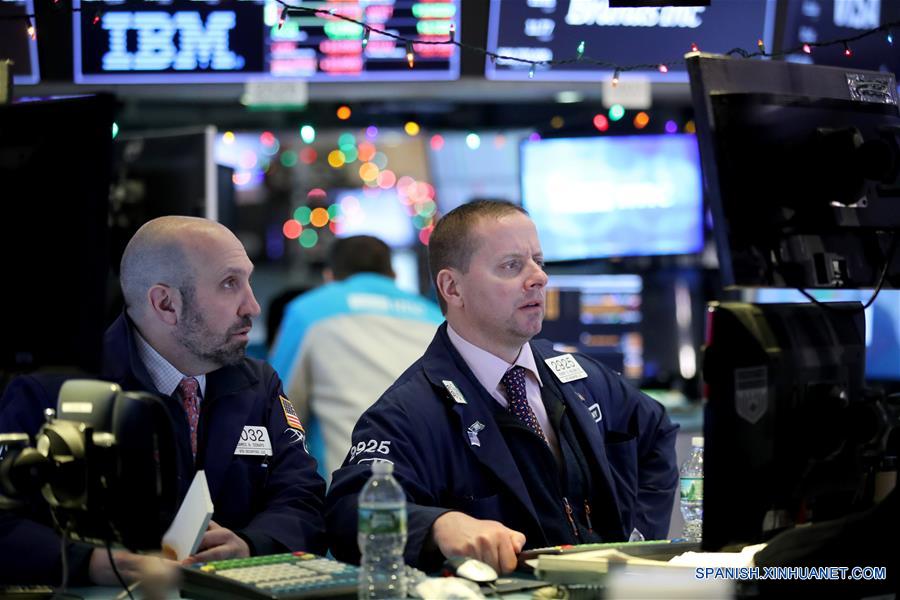 Comerciantes trabajan en la Bolsa de Valores de Nueva York, en Nueva York, Estados Unidos, el 24 de diciembre de 2018. Wall Street cerró el lunes con enormes pérdidas y la mayoría de los principales índices registraron su peor víspera de Navidad, con lo que extendieron las pérdidas de la semana anterior. El Promedio Industrial Dow Jones perdió 653.17 puntos, o 2.91 por ciento, para terminar en 21,792.20 unidades. El índice Standard & Poor's 500 cayó 65.52 puntos, o 2.71 por ciento, para ubicarse en 2,351.10 unidades. El índice compuesto Nasdaq disminuyó 140.08 puntos, o 2.21 por ciento, para cerrar en 6,192.92 unidades. (Xinhua/Wang Ying)