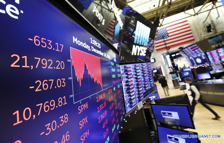 Información del mercado de valores es mostrada en una pantalla electrónica en la Bolsa de Valores de Nueva York, en Nueva York, Estados Unidos, el 24 de diciembre de 2018. Wall Street cerró el lunes con enormes pérdidas y la mayoría de los principales índices registraron su peor víspera de Navidad, con lo que extendieron las pérdidas de la semana anterior. El Promedio Industrial Dow Jones perdió 653.17 puntos, o 2.91 por ciento, para terminar en 21,792.20 unidades. El índice Standard & Poor's 500 cayó 65.52 puntos, o 2.71 por ciento, para ubicarse en 2,351.10 unidades. El índice compuesto Nasdaq disminuyó 140.08 puntos, o 2.21 por ciento, para cerrar en 6,192.92 unidades. (Xinhua/Wang Ying)