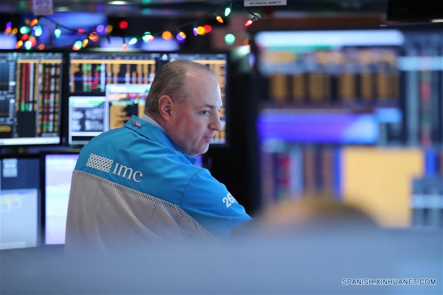 Un comerciante trabaja en la Bolsa de Valores de Nueva York, en Nueva York, Estados Unidos, el 24 de diciembre de 2018. Wall Street cerró el lunes con enormes pérdidas y la mayoría de los principales índices registraron su peor víspera de Navidad, con lo que extendieron las pérdidas de la semana anterior. El Promedio Industrial Dow Jones perdió 653.17 puntos, o 2.91 por ciento, para terminar en 21,792.20 unidades. El índice Standard & Poor's 500 cayó 65.52 puntos, o 2.71 por ciento, para ubicarse en 2,351.10 unidades. El índice compuesto Nasdaq disminuyó 140.08 puntos, o 2.21 por ciento, para cerrar en 6,192.92 unidades. (Xinhua/Wang Ying)
