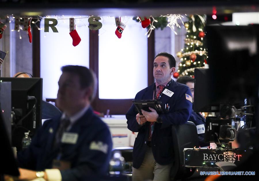 Comerciantes trabajan en la Bolsa de Valores de Nueva York, en Nueva York, Estados Unidos, el 24 de diciembre de 2018. Wall Street cerró el lunes con enormes pérdidas y la mayoría de los principales índices registraron su peor víspera de Navidad, con lo que extendieron las pérdidas de la semana anterior. El Promedio Industrial Dow Jones perdió 653.17 puntos, o 2.91 por ciento, para terminar en 21,792.20 unidades. El índice Standard & Poor's 500 cayó 65.52 puntos, o 2.71 por ciento, para ubicarse en 2,351.10 unidades. El índice compuesto Nasdaq disminuyó 140.08 puntos, o 2.21 por ciento, para cerrar en 6,192.92 unidades. (Xinhua/Wang Ying)