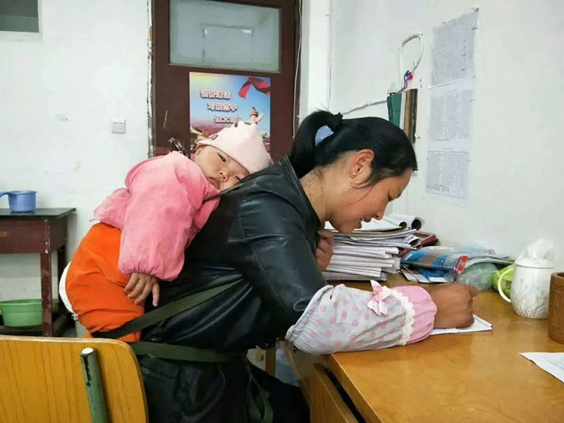 11. Lleva a su hijo a espaldas mientras trabaja, solo para no interrumpir las clases de los estudiantes