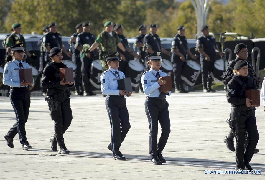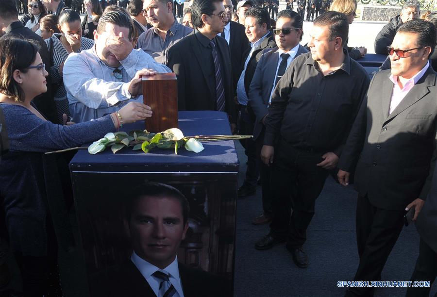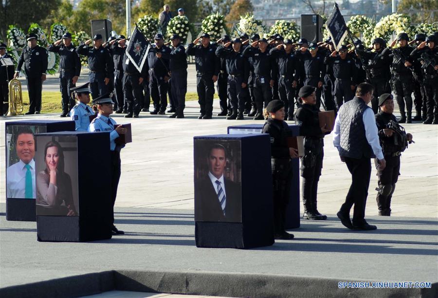 Elementos de seguridan trasladan las urnas que contienen las cenizas de la gobernadora del estado de Puebla, Martha Erika Alonso y su esposo, el senador Rafael Moreno Valle, así como tripulantes que viajaban en el helicóptero accidentado, para su ceremonia luctuosa en la Plaza de la Victoria, en el estado de Puebla, México, el 25 de diciembre de 2018. De acuerdo con información de la prensa local, familiares, amigos y figuras políticas acudieron el martes a la Plaza de la Victoria para rendir homenaje a la gobernadora del estado de Puebla, Martha Erika Alonso y su esposo, el senador Rafael Moreno Valle, quienes perdieron la vida el lunes tras desplomarse el helicóptero que los transportaba. (Xinhua/Fernando Camacho)