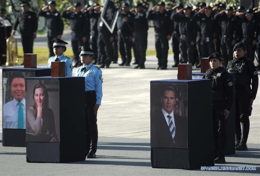 Elementos de seguridan montan guardia frente a las urnas que contienen las cenizas de la gobernadora del estado de Puebla, Martha Erika Alonso y su esposo, el senador Rafael Moreno Valle, así como tripulantes que viajaban en el helicóptero accidentado, durante su ceremonia luctuosa en la Plaza de la Victoria, en el estado de Puebla, México, el 25 de diciembre de 2018. De acuerdo con información de la prensa local, familiares, amigos y figuras políticas acudieron el martes a la Plaza de la Victoria para rendir homenaje a la gobernadora del estado de Puebla, Martha Erika Alonso y su esposo, el senador Rafael Moreno Valle, quienes perdieron la vida el lunes tras desplomarse el helicóptero que los transportaba. (Xinhua/Fernando Camacho)