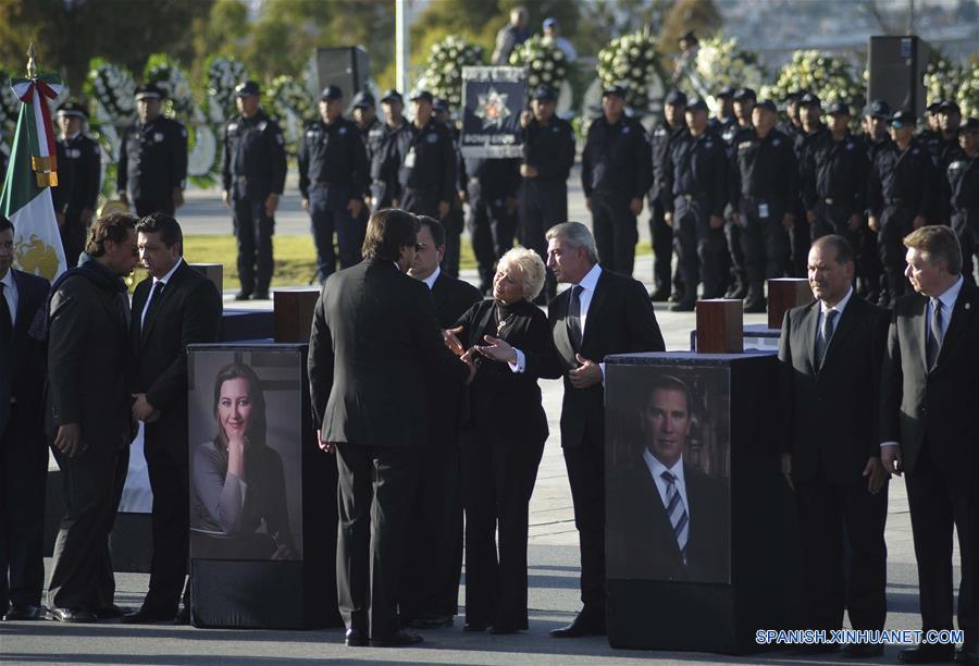 Elementos de seguridan sostienen las urnas que contienen las cenizas de la gobernadora del estado de Puebla, Martha Erika Alonso y su esposo, el senador Rafael Moreno Valle, así como tripulantes que viajaban en el helicóptero accidentado, durante su ceremonia luctuosa en la Plaza de la Victoria, en el estado de Puebla, México, el 25 de diciembre de 2018. De acuerdo con información de la prensa local, familiares, amigos y figuras políticas acudieron el martes a la Plaza de la Victoria para rendir homenaje a la gobernadora del estado de Puebla, Martha Erika Alonso y su esposo, el senador Rafael Moreno Valle, quienes perdieron la vida el lunes tras desplomarse el helicóptero que los transportaba. (Xinhua/Fernando Camacho)