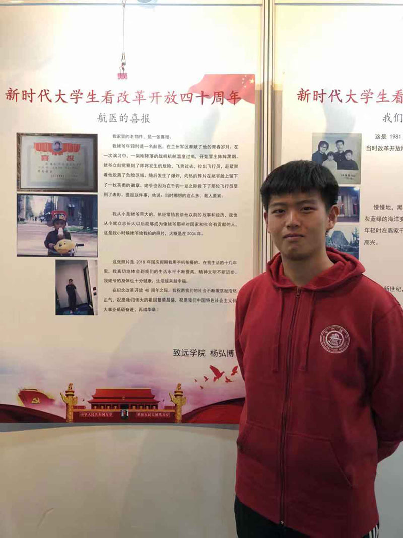 "Mi abuelo me ense?ó una carta de felicitación que le entregaron cuando era médico aeronáutico del comando militar de Lanzhou", precisa Yang Hongbo, estudiante de licenciatura en información electrónica, para explicar la pieza que expone.