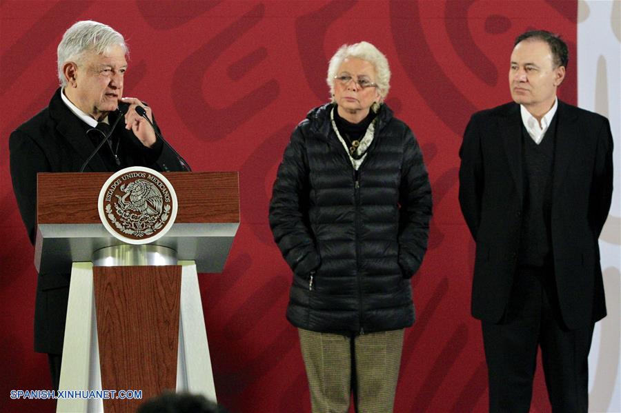CIUDAD DE MEXICO, diciembre 26, 2018 (Xinhua) -- El presidente de México, Andrés Manuel López Obrador (i), acompa?ado por la secretaria mexicana de Gobernación, Olga Sánchez Cordero (c), y el secretario de Seguridad pública, Alfonso Durazo (d), participa durante una conferencia de prensa matutina, en Palacio Nacional, en la Ciudad de México, capital de México, el 26 de diciembre de 2018. El presidente de México, Andrés Manuel López Obrador, prometió el miércoles "no ocultar absolutamente nada" sobre las causas del accidente aéreo en el que pereció el pasado lunes la gobernadora de Puebla, Martha Erika Alonso y su esposo, el senador Rafael Moreno Valle. (Xinhua/Str)