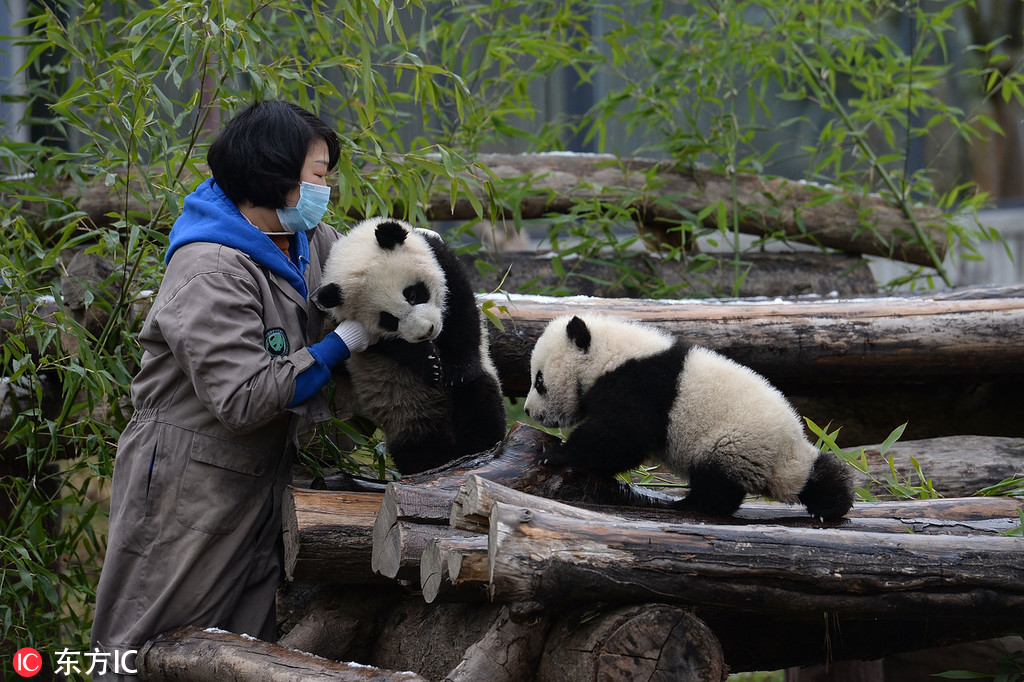 Los cachorros de panda gemelos durante la ceremonia de nombramiento en la base de reproducción Shenshuping de la Reserva Natural Nacional Wolong, en las prefecturas autónomas tibetana y qiang de Ngawa, provincia de Sichuan, suroeste de China, el 26 de diciembre de 2018. [Foto / IC]