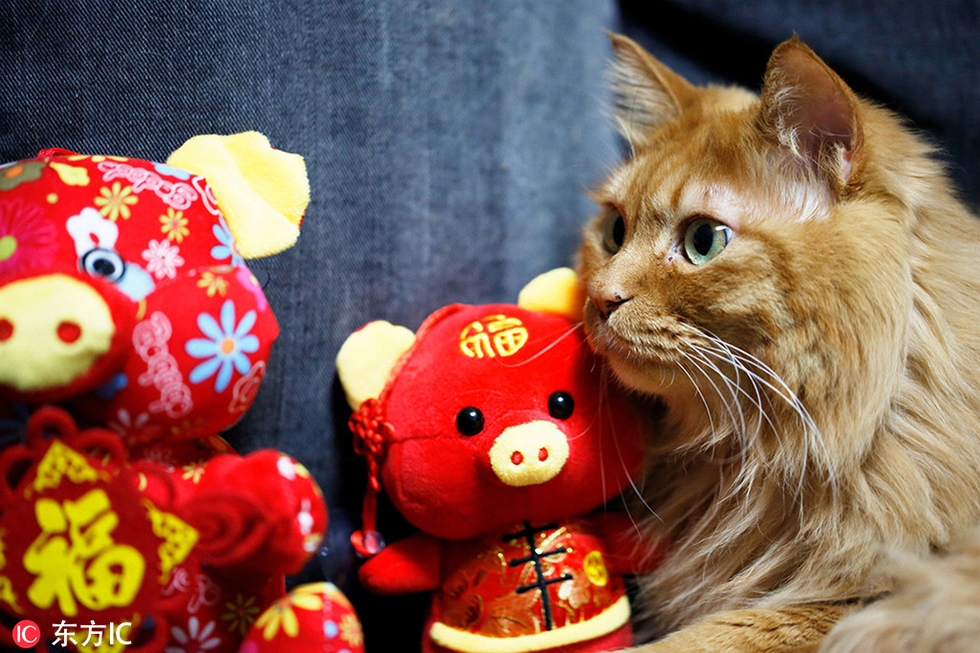 Un gato sobre una mascota con forma de cerdo en Beijing, el 20 de diciembre de 2018. [Foto / IC]