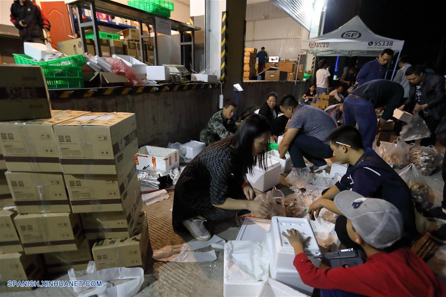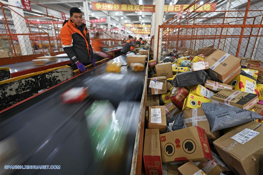 YINCHUAN, diciembre 28, 2018 (Xinhua) -- Imagen del 12 de noviembre de 2018, de trabajadores laborando en un centro de distribución laborando en una compa?ía de entregas express en Yinchuan, en la Región Autónoma Hui de Ningxia, en el noroeste de China. El sector de entregas express de China ha manejado 50 mil millones de paquetes en lo que va del a?o, informó el viernes la Oficina Postal Estatal. Impulsada por el comercio electrónico, la industria de entregas express vio un rápido crecimiento en los últimos 3 a?os, con el número de paquetes aumentando en 10 mil millones en promedio en cada uno de los últimos 3 a?os, dijo la oficina. China ha estado en el primer puesto en el mercado mundial en los últimos 3 a?os consecutivos, sobrepasando el monto de manejo combinado de economías desarrolladas como Estados Unidos, Japón y Europa. (Xinhua/Wang Peng)